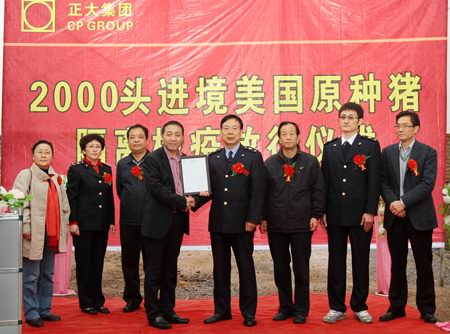 放行儀式上,陜西出入境檢驗檢疫局代表做了檢疫放行報告:“經(jīng)過3個多月的隔離檢驗,正大集團(tuán)農(nóng)牧食品企業(yè)(中國區(qū))引進(jìn)的2000頭原種豬完全符合安全檢疫標(biāo)準(zhǔn),準(zhǔn)予放行?!标兾鞒鋈刖硻z驗檢疫局代表為正大集團(tuán)陜西區(qū)陳強(qiáng)總裁頒發(fā)了《種豬檢疫合格證書》。