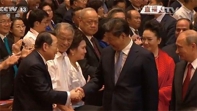 《勝利與和平》文藝晚會現(xiàn)場,習(xí)近平主席和謝國民董事長親切握手