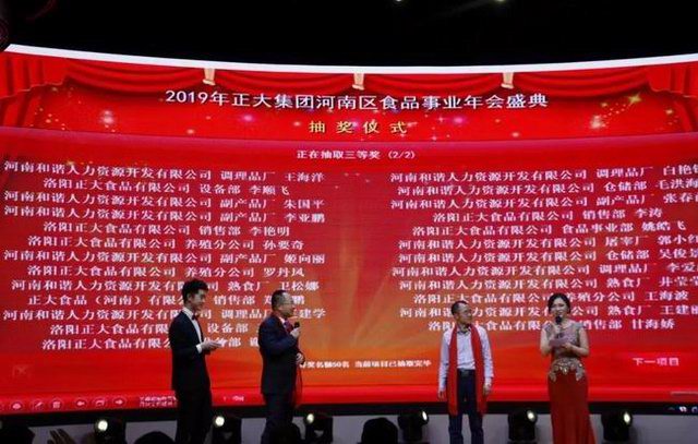 2019年1月21日,“龍頭騰起攬全月,鴻鵠展翅傲中原”——正大集團(tuán)河南區(qū)食品事業(yè)2019新春年會(huì)在洛陽東華大酒樓盛大召開。正大集團(tuán)農(nóng)牧食品企業(yè)(中國(guó))副董事長(zhǎng)王鴻章、正大集團(tuán)河南區(qū)食品事業(yè)***總裁王學(xué)斌、正大集團(tuán)河南區(qū)產(chǎn)業(yè)化總裁宋小兵及河南區(qū)食品事業(yè)各公司部門主管、員工代表300余人齊聚一堂,共享盛典。年會(huì)特邀河南東方正大有限公司洛陽飼料廠董事長(zhǎng)茹懷智、中方副總經(jīng)理黃天發(fā)及河南和諧人力資源開發(fā)有限公司董事、總經(jīng)理王縣委、副總經(jīng)理張麗云參加。