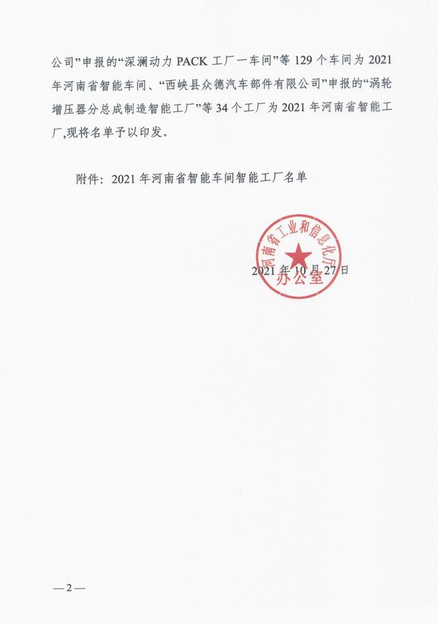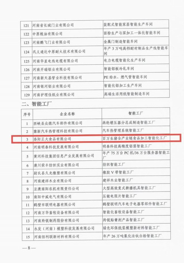 按照《河南省工業(yè)和信息化廳辦公室關(guān)于開(kāi)展2021年度河南省智能車(chē)間智能工廠申報(bào)工作的通知》(豫工信辦產(chǎn)融〔2021〕163號(hào)),經(jīng)企業(yè)志愿申報(bào)、各地工業(yè)和信息化主管部門(mén)初審和現(xiàn)場(chǎng)核查、省工業(yè)和信息化廳組織專(zhuān)家評(píng)審、網(wǎng)上公示,河南省工業(yè)和信息化廳確定129個(gè)智能車(chē)間為2021年河南省智能車(chē)間、34個(gè)智能工廠為2021年河南省智能工廠。2021年10月27日,河南省工業(yè)和信息化廳辦公室下發(fā)文件《河南省工業(yè)和信息化廳辦公室關(guān)于印發(fā)2021年河南省智能車(chē)間智能工廠名單的通知》(豫工信辦產(chǎn)融【2021】195號(hào))予以公布。洛陽(yáng)正大獲評(píng)2021年河南省智能工廠!