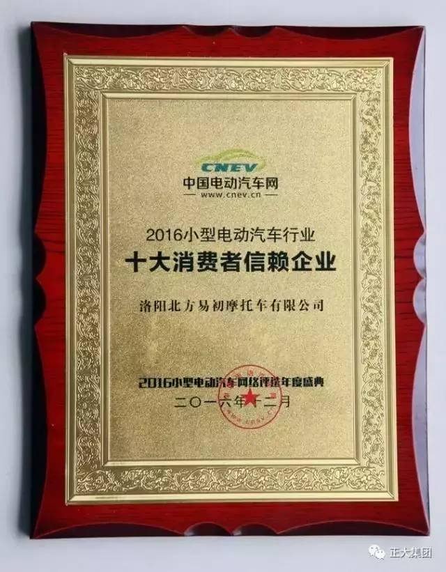 ▲洛陽北易榮獲2016小型電動汽車行業(yè)“十大消費者信賴企業(yè)”