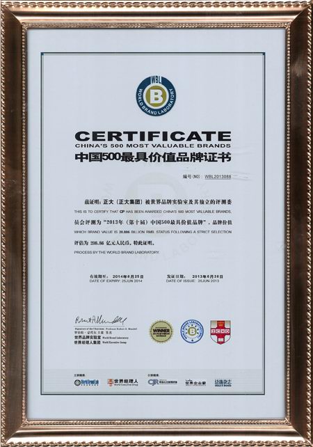 6月26日,由世界品牌實驗室、世界經(jīng)理人雜志等機構(gòu)主辦的世界品牌大會暨2013年第十屆《中國500***具價值品牌》發(fā)布會在北京東方君悅大酒店召開。會議發(fā)布了2013第十屆《中國500***具價值品牌》排行榜,正大集團以208.86億元的品牌價值位居第88位。美國耶魯大學(xué)管理學(xué)院萊維·多爾教授(右一)、法國歐洲工商管理學(xué)院瓊·克勞德·拉里齊教授(左二)以及英國牛津大學(xué)商學(xué)院斯蒂芬·沃格教授(左一)為正大集團頒獎。董事長辦公室(北京)楊海浩總裁(右二)代表集團接受獎杯及證書。